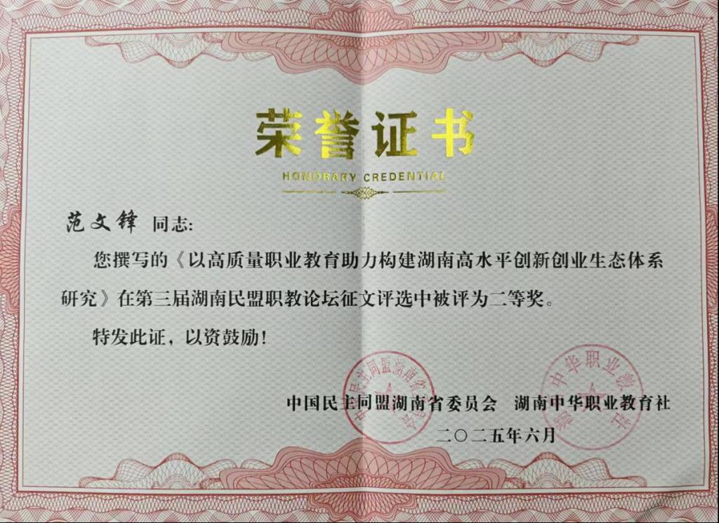 6月19-20日,第三届湖南民盟职教论坛在衡阳召开。英国上市公司官网365盟员范文锋撰写的《以高质量职业教育助力构建湖南高水平创新创业生态体系研究》在第三届湖南民盟职教论坛征文评选中被评为二等奖,受到民盟湖南省委、湖南中华职业教育社的表彰。