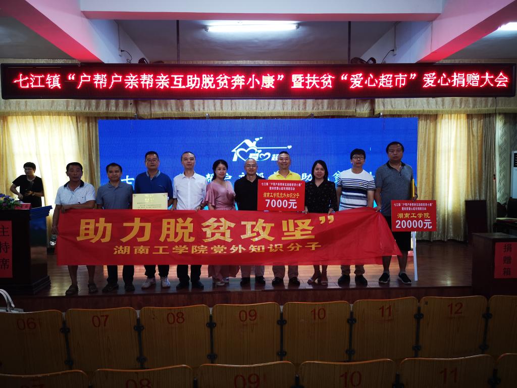7月30日,校党委副书记张平和党委委员、杨朗与民革湖工支部主委李泽军、民盟湖工总支主委蒋美生、九三学社湖工支社主委杨凤鸣、湖工知联会会长李坦平一道,带着全校广大党外知识分子对贫困群众的爱心,顶着高温酷暑来到隆回县七江镇,向该镇扶贫“爱心超市”进行捐赠。