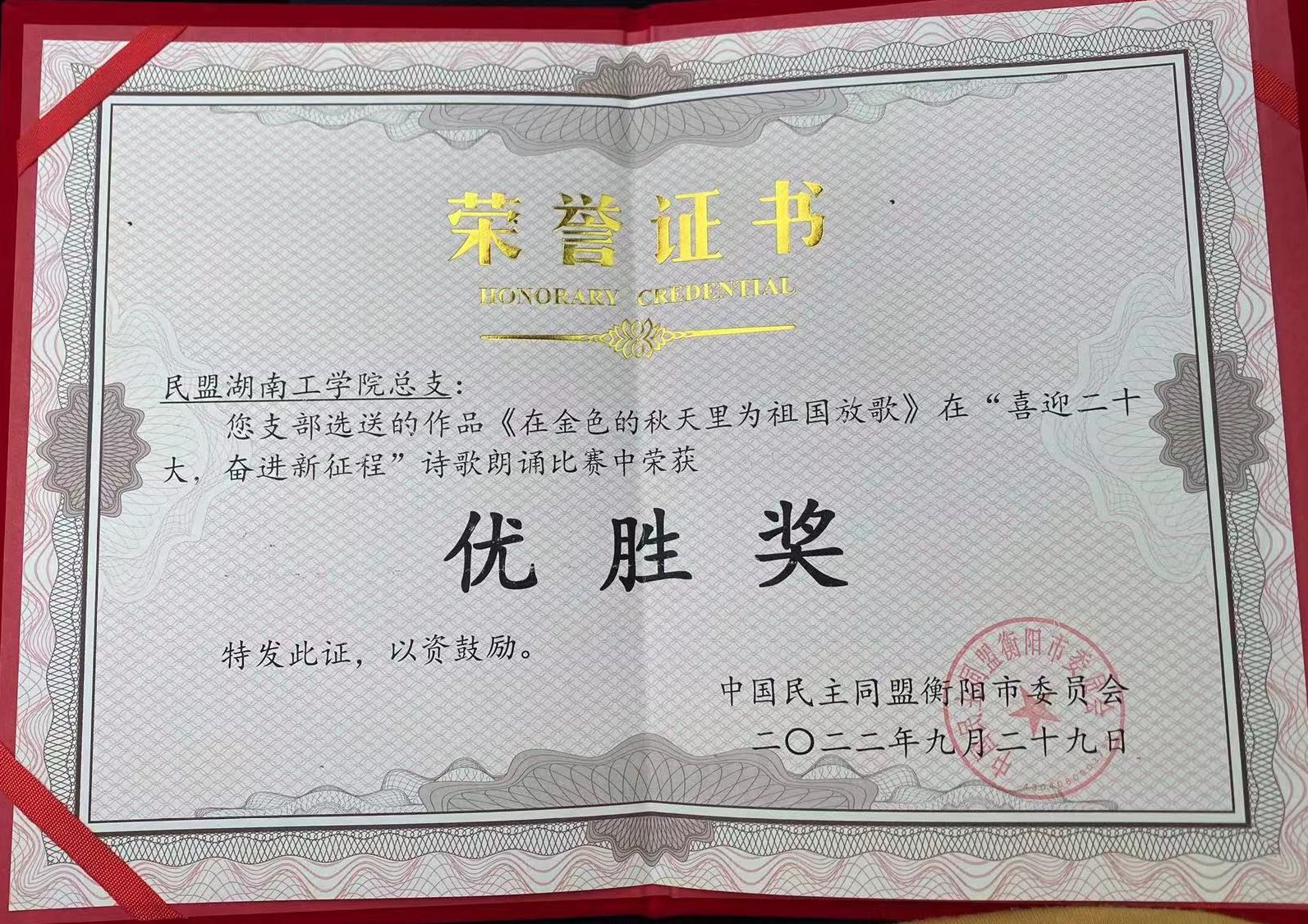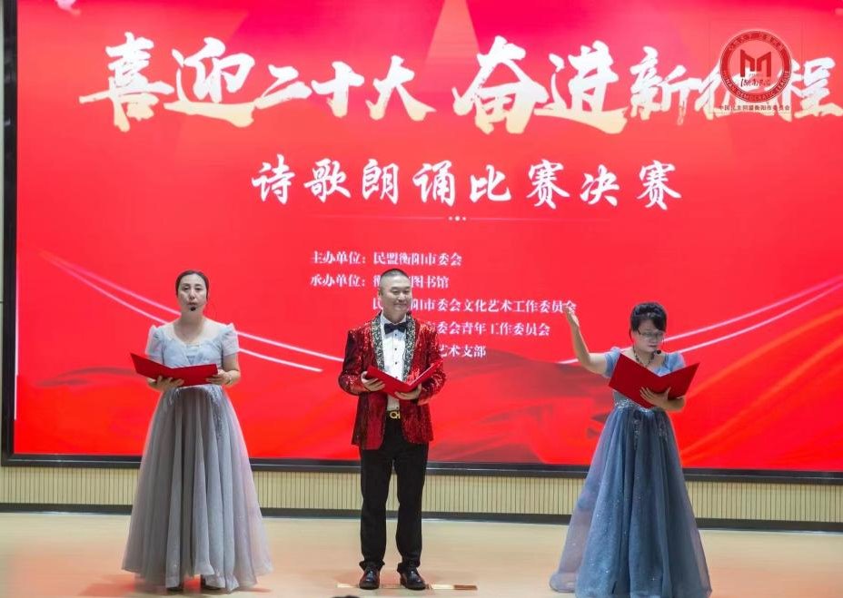 9月29日,民盟衡阳市委在衡阳市图书馆举办“喜迎中共二十大、携手奋进新时代”诗歌朗诵比赛,民盟英国上市公司官网365总支主委范文锋与盟员陈一文、蒋美生、沈航充满激情地朗诵了《在金色的秋天放歌》,歌颂了伟大的祖国、伟大的中国共产党,比赛获得优胜奖。(范文锋供稿)