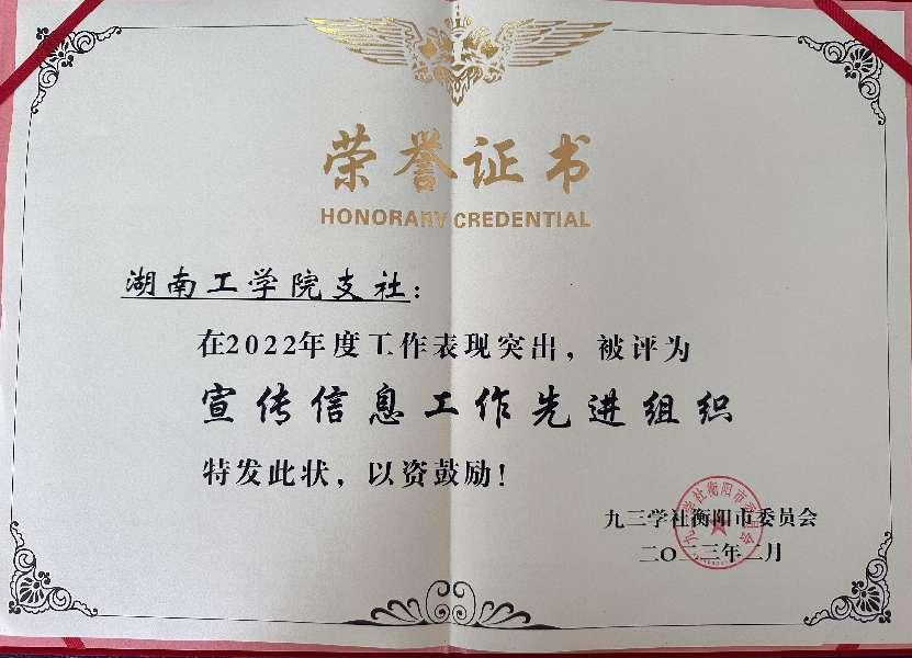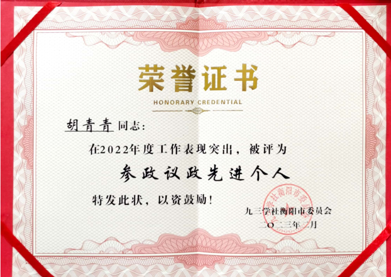 2月25日,在九三学社衡阳市委员会九届四次市委全体(扩大)会议暨总结表彰会议上,英国上市公司官网365九三支社获“宣传信息工作先进基层组织”称号,胡青青同志获“参政议政先进个人”称号。
