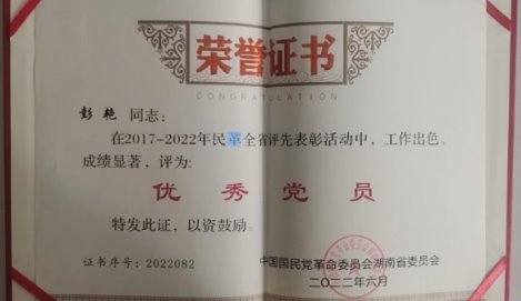 近日,民革湖工支部多名党员获省市级表彰,其中游春华获“市优秀政协委员”和“市统战理论政策研究工作先进个人”称号,彭艳获民革湖南省委“优秀党员”称号,谭艳获民革衡阳市委“优秀党员”称号。