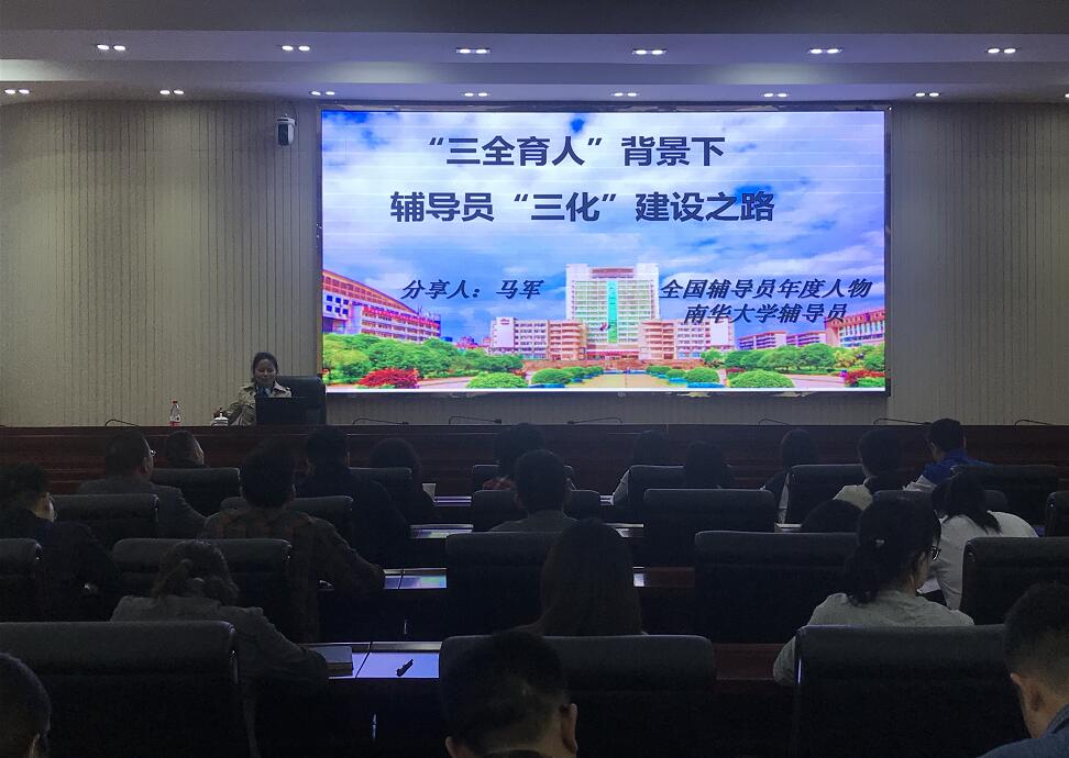 10月14日下午,第十届全国高校辅导员年度人物、南华大学辅导员马军教授应邀来校作专题报告。各二级学院党委副书记、学工办主任以及全体辅导员参加。活动由学生工作处(部)副处长刘斌主持。