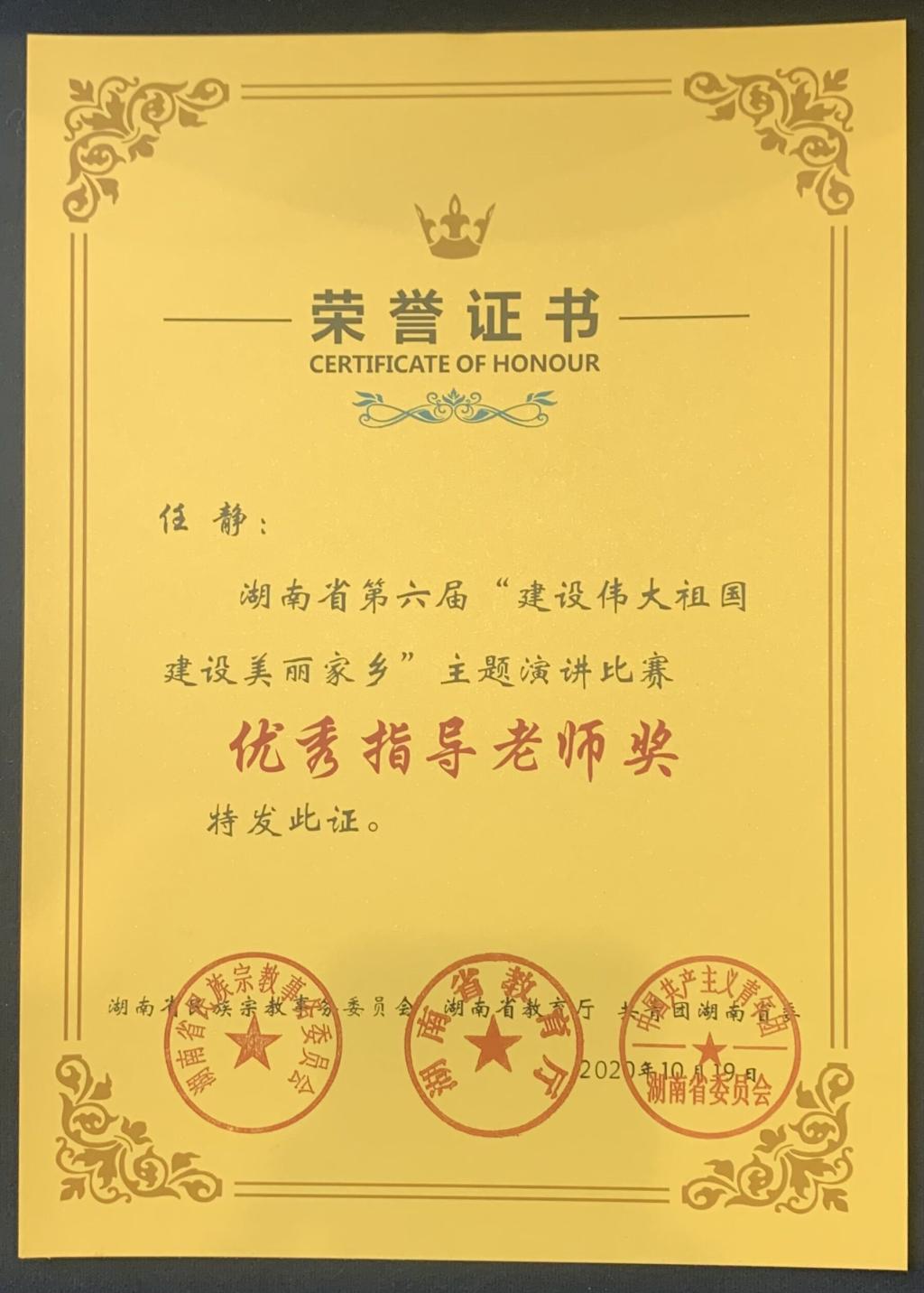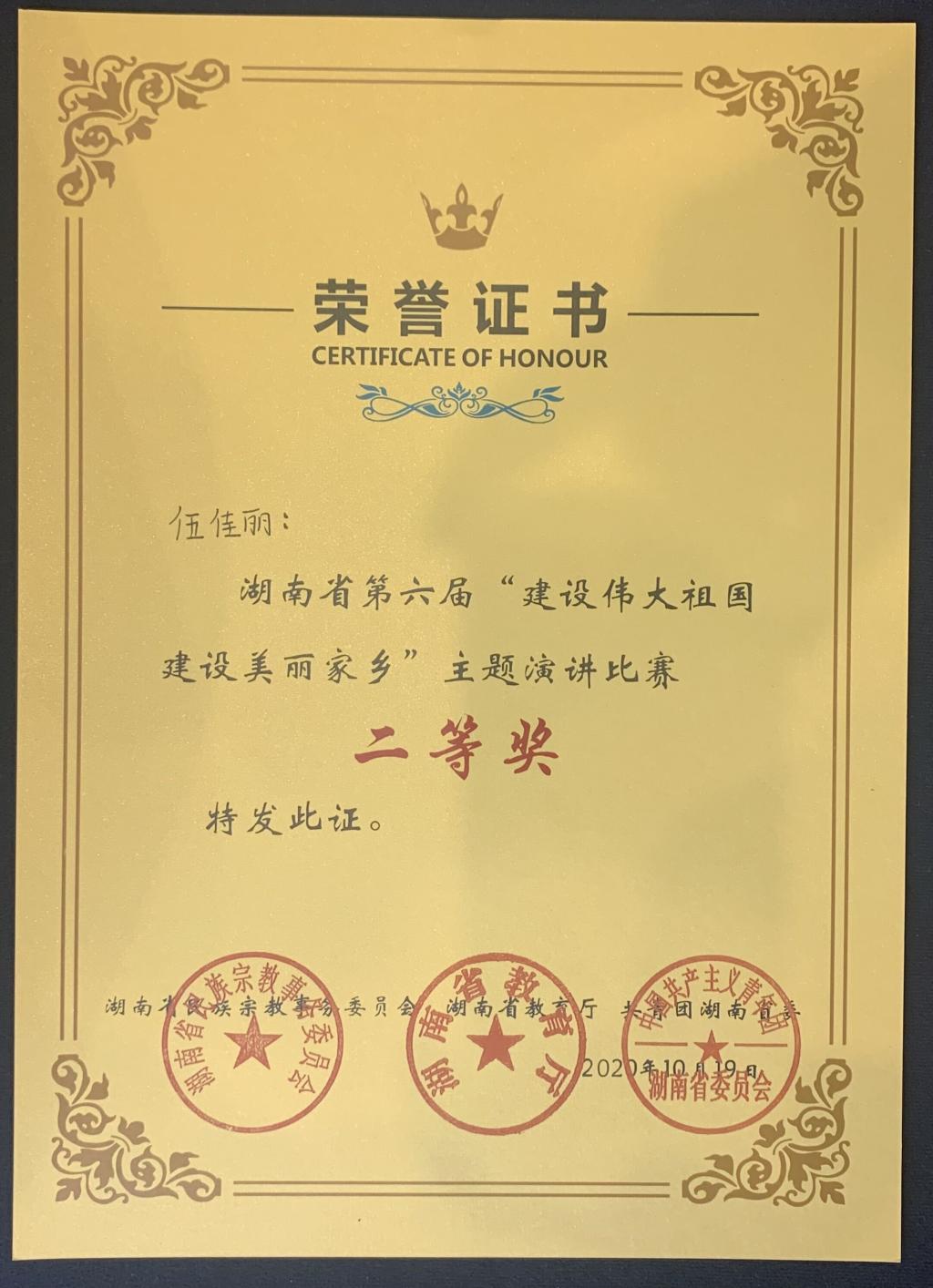 2020年10月19日,由省民宗委、省教育厅、共青团湖南省委联合举办的湖南省第六届“建设伟大祖国 建设美丽家乡”主题演讲比赛中,英国上市公司官网365经济管理学院会计1801班伍佳丽同学获得全省二等奖,任静老师获得优秀指导老师奖。(学生工作处)