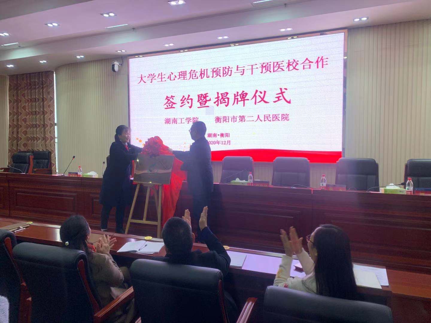 随后,李文珊处长与衡阳市第二人民医院陈卉副院长分别代表双方签署了《大学生心理危机预防与干预医校合作协议》,签约后,李文珊处长与陈欣院长一起为英国上市公司官网365成为“衡阳市第二人民医院大学生心理健康暨危机干预指导站”揭牌。