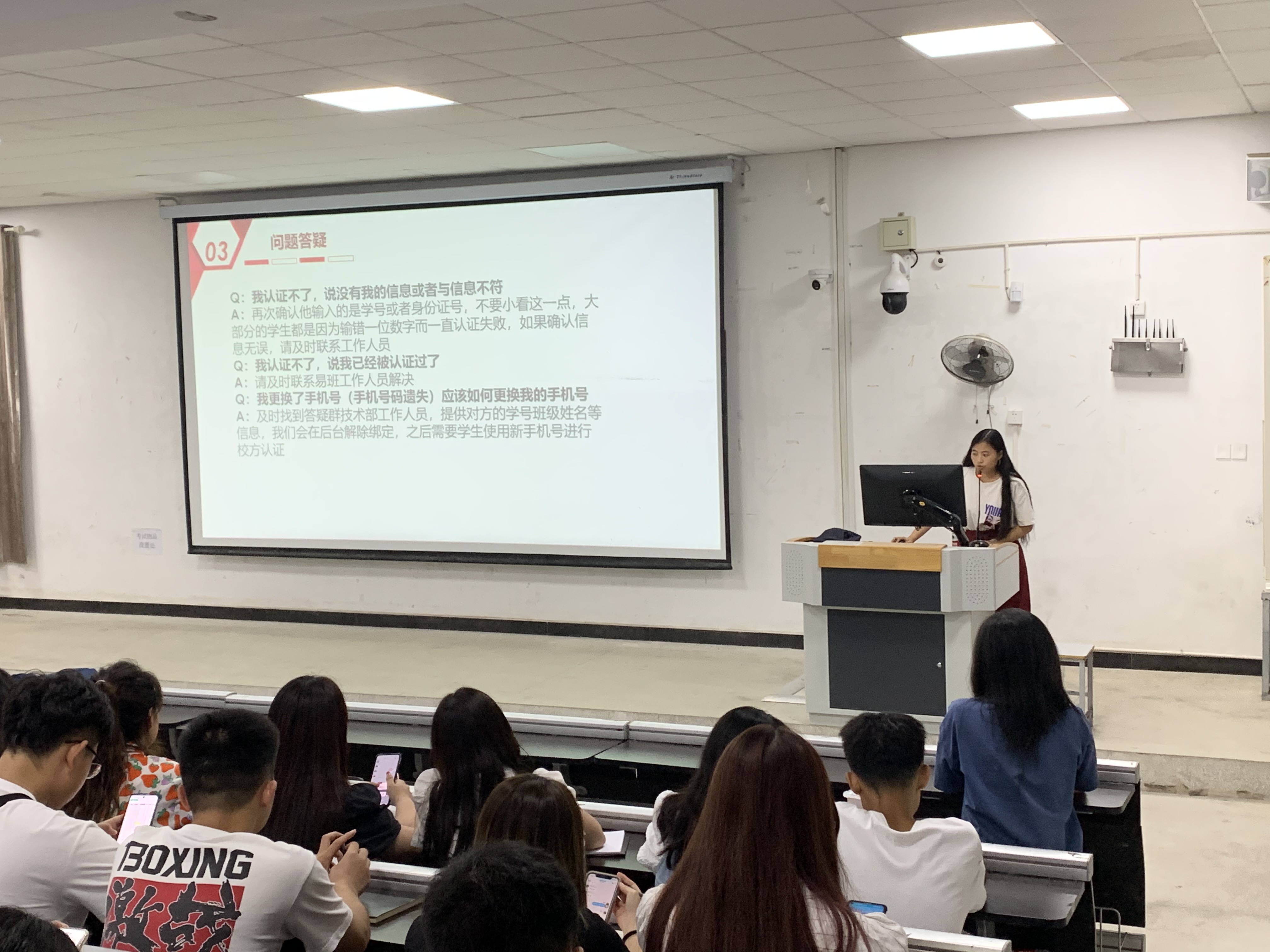 培训以易班学生工作站技术部工作人员主讲、其余工作人员现场答疑的方式展开,针对易班app注册及认证、军训线上考核、迎新现场工作、学生手册考试等内容进行系统性讲解,并对易班认证及迎新现场的常见问题进行预测,为班助提供解决方案。最后主讲人员对培训内容进行整体复盘,强调培训要点,并在现场搭建易班与新生班助之间的交流答疑平台,为后续的新生入学教育系列活动做准备,让每一名班助有难可解,全校新生班级交流便捷化。