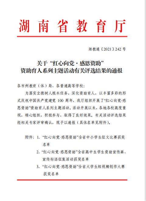 为落实立德树人根本任务,深化资助育人,以丰富多彩的形式庆祝中国共产党建党100周年,湖南省教育厅组织开展了“红心向党·感恩资助”全省大学生短视频创作大赛。