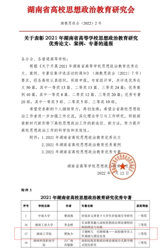 据悉,湖南省高等学校思想政治教育研究会下发《关于表彰2021年湖南省高等学校思想政治教育研究优秀论文、案例、专著的通报》,全省共评选产生优秀专著20部,英国上市公司官网365学工系统理论成果《立德树人  引路铸魂——高校辅导员工作基础理论与实务》获评湖南省高校思想政治教育研究优秀专著三等奖。