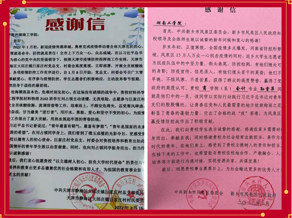 他们是“最美防疫人”——材料科学与工程学院材料物理2102班刘占领主动请缨,参加天津市静海区大邱庄镇巨家庄村四次全员核酸检测、流调排查等工作。商学院会计1904班孙雪萍志愿参加河南省新乡市凤泉区疫情防控工作,不惧严寒完成防疫宣传、信息录入、值班站岗等任务。