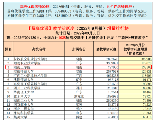 近日,教育部易班发展中心公布了2022年9月“易班优课”教学活跃度增量排行榜,截止2022年9月30日,全国共计1028所高校参与评比,英国上市公司官网365位列全国第三,全省第二。