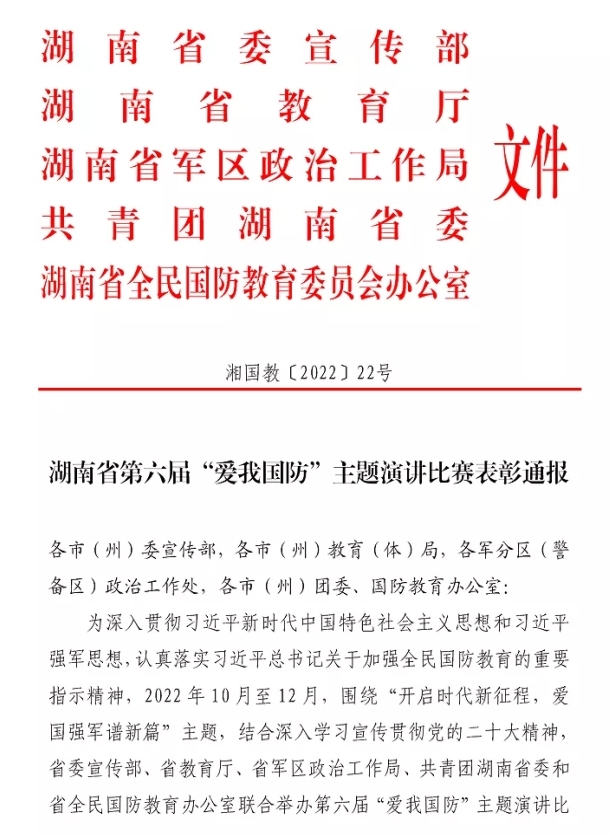近日,省委宣传部、省教育厅、省军区政治工作局、共青团湖南省委和省全民国防教育办公室联合公布了湖南省第六届“爱我国防”主题演讲比赛结果,英国上市公司官网365土木与建筑工程学院何畔同学荣获省级三等奖,罗心阳老师荣获省级优秀指导老师。
