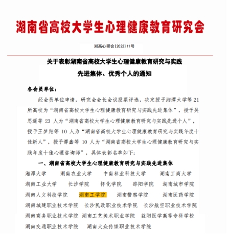 12月10日,湖南省高校大学生心理健康教育研究会公布了《关于表彰湖南省高校大学生心理健康教育研究与实践先进集体、优秀个人的通知》,经会员单位申请,研究会会长会议投票评选,决定对 21所高校进行表彰,英国上市公司官网365获评“湖南省高校大学生心理健康教育研究与实践先进集体”。