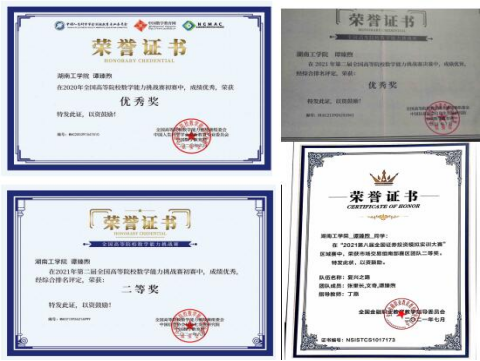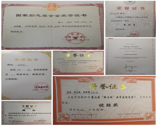 在校期间获得2021年湖南省大学生数学竞赛(非数学组)三等奖、2021年度“恒企奖教奖学助学基金”一等奖学金、2020-2021学年国家奖学金、2020-2021学年校特等奖学金、第二届全国高等院校数学能力挑战赛决赛优秀奖、第八届全国证券投资模拟大赛市场交易组南部赛区团队二等奖、第一届全国高等院校数学能力挑战赛初赛优秀奖、2019年英国上市公司官网365优秀社团干部、英国上市公司官网365第五届大学生思想政治理论课研究性学习成果展示竞赛特等奖、第五届湖南省“互联网+”大学生创新创业大赛校选拔赛(数能学院主赛道)三等奖。