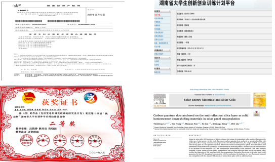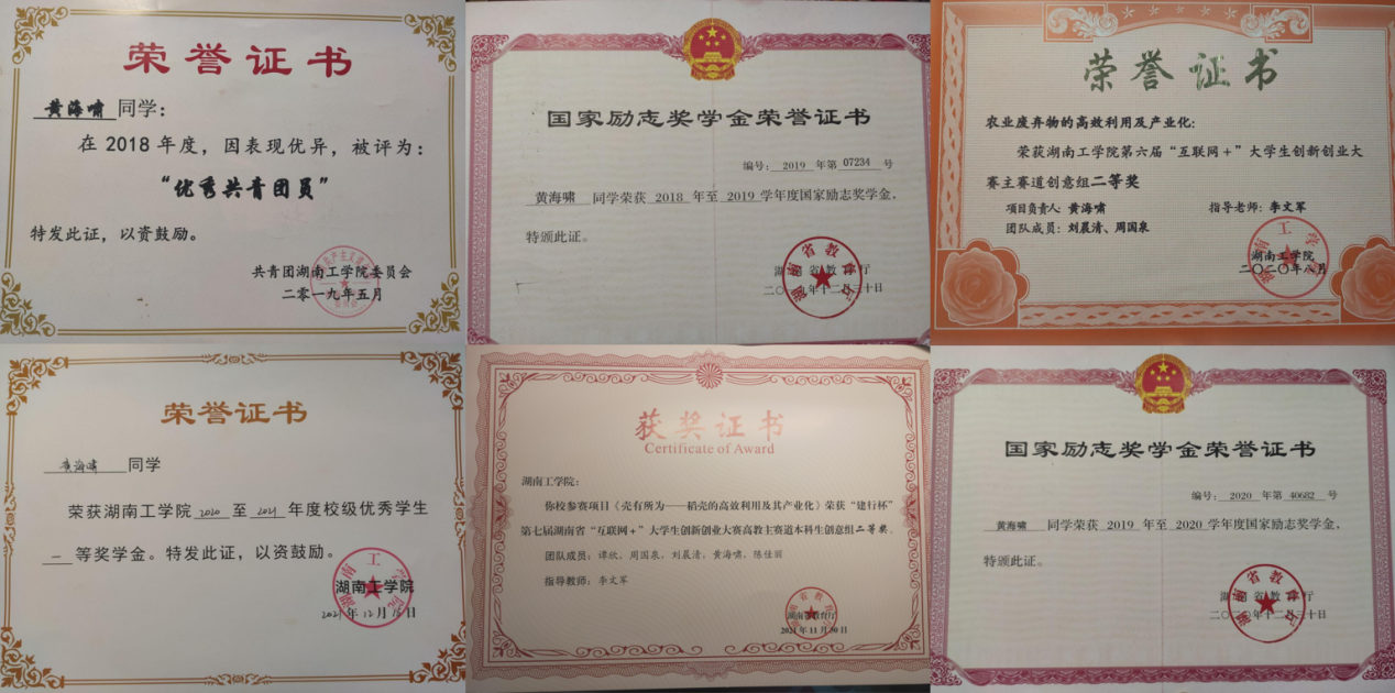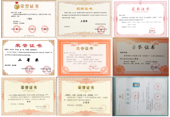 自大一下学期开始跟随老师进行创新创业项目的实验,并在学长的指导和带领下参加相关竞赛,后主持相关比赛项目并取得一定成绩,在校期间已经获得校二等奖;第七届“互联网+”“建行杯”省级二等奖;第十一届湖南省大学生课外化学化工类创新作品竞赛一等奖;第十三届“挑战杯”湖南省大学生课外学术科技作品竞赛,省级三等奖等各项奖项。