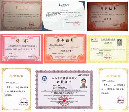 在校期间好学好问成绩排在年级上游,并且会参加各种竞赛和活动,获互联网+创新创业大赛省赛二等奖1次、校赛二等奖1次、院赛二等奖1次、SAMPE复合材料竞赛获奖1次、校三好学生1次、校二等奖学金1次、校三等奖学金2次、CH知识竞赛三等奖1次;顺利通过英语四级、国家计算机二级、初中化学教师资格证;在课余时间,积极参加乐队活动、科研项目,丰富了课后生活。