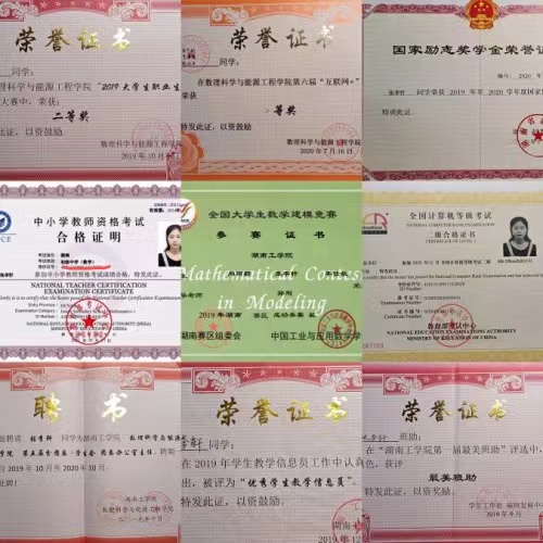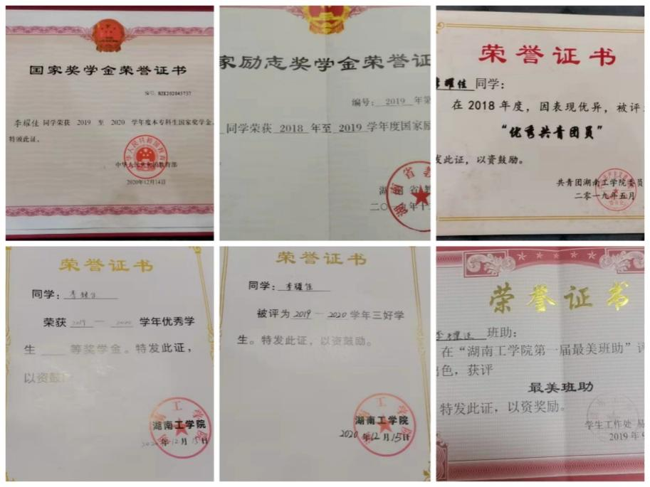 在校期间自大二上学期协助教师参与科研工作,总计拿过奖学金2次,校级三好学生1次,优秀信息记录员1次等;并在大学期间参加有太极拳、湖南百公里毅行等运动竞;力学、物理、数学等学科竞赛,取得一定成绩;且多次参加校内外“挑战杯”、“互联网+”等比赛,共计省级奖项3项,校级奖项3项,院级奖项若干。
