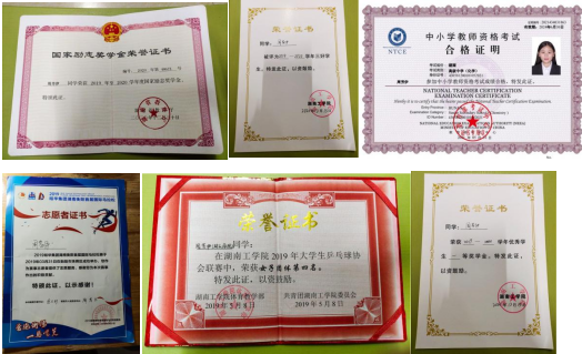 在校期间学习成绩和综测均为专业前五,连续三年获国家励志奖学金,2019年及2021年获校级二等奖学金,2020年获校级一等奖学金、校级三好学生和校级优秀团员;顺利通过英语四级、国家计算机二级考试、高中化学教师资格考试;在课余时间,积极参加校运会、乒乓球比赛、马拉松志愿者、大学生复合材料机翼竞赛等。