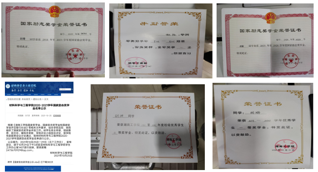 在校期间获得优秀学生干部、三好学生、三好学生标兵、一等奖学金、国家励志奖学金。顺利通过英语四六级,参与专业网课建设,《复合材料力学——从基础到应用》目前已超过6000人参与学习。曾担任材化学院创新创业孵化基地项目负责人、第十三届SAMPE超轻机翼/复合材料桥梁设计大赛队长、获得衡阳市优秀志愿者、职业生涯规划大赛三等奖、优秀运动员、社团活动积极分子、优秀部长等。