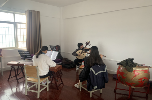 “您看,这是我们的社团活动室,民族管弦协会的同学们正在练习。他们之前的活动室分散在教学楼里,平时白天练习会干扰到上课教学,只能晚上排练。但现在有了固定场地,白天晚上都可以练习了。”