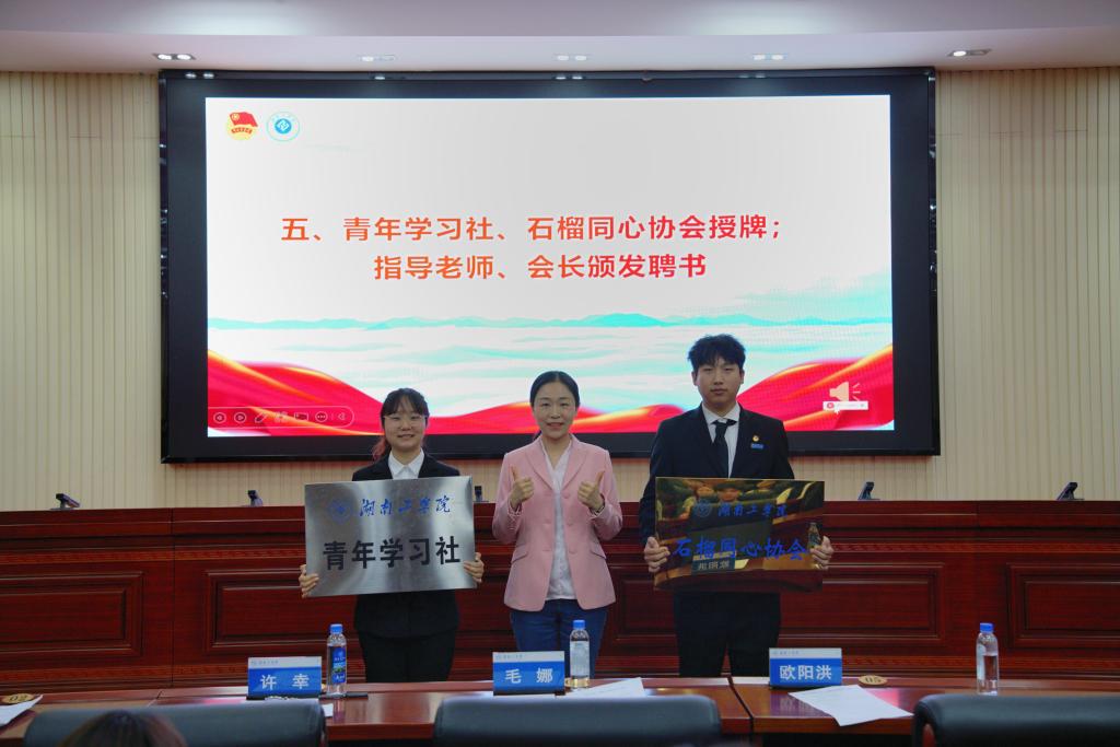 校团委书记毛娜为青年学习社、石榴同心协会授牌,为指导老师颁发聘书。