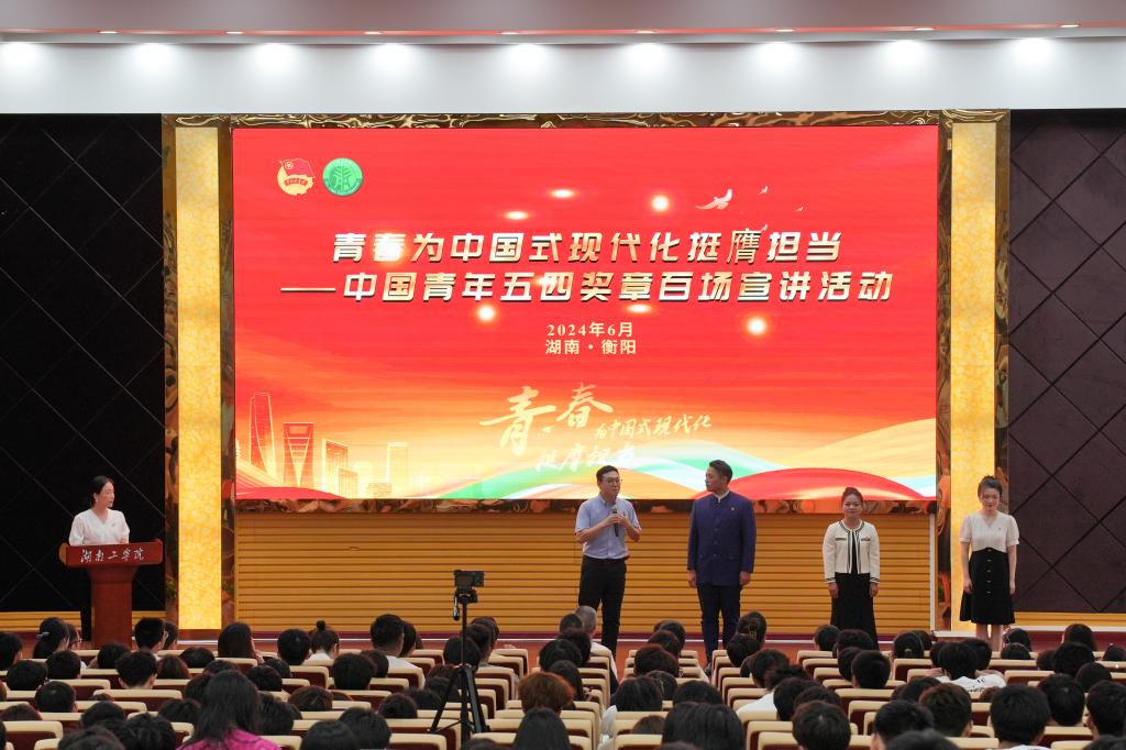 活动在第28届中国青年五四奖章宣传片中拉开序幕。第28届中国青年五四奖章获奖者朱霞介绍了自己作为“兴农人”,带领乡亲们走上现代化农业致富之路的奋斗故事。祁东融媒体中心记者、青年讲师团成员江杨子分享了自己从青年大学生到宣传家乡的媒体人,再到中宣部“金牌讲解员”的成长经历和青春感悟。第20届衡阳青年五四奖章获得者、南华大学资源环境与安全工程学院副院长、青年讲师团成员徐守龙讲述了自己和爷爷祖孙两代投身祖国核事业的故事,鼓励新时代青年学子继承和发扬“两弹一星”精神。湖南中医药大学马克思主义学院教师、青年讲师团成员李文术从一粒种子出发,讲述了袁隆平院士“把中国人的饭碗牢牢端在自己手上”矢志不渝的感人故事,号召大家在祖国最需要的地方扎根,争做“有理想、敢担当、能吃苦、肯奋斗”的新时代青年。