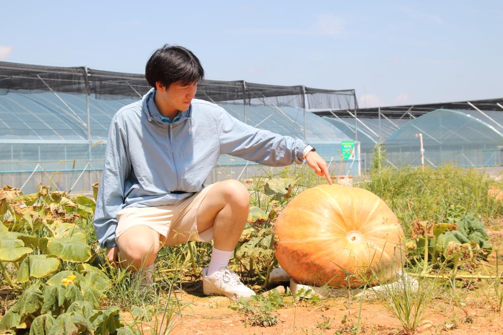 “100多斤!长这么大还是第一次见这么大的南瓜……”团队成员看着眼前的巨大无比南瓜纷纷感到惊奇。