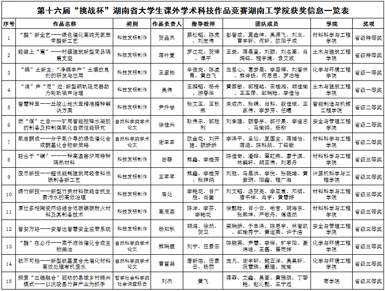 英国上市公司官网365参加第十六届“挑战杯”湖南省大学生课外学术科技作品竞赛获奖信息