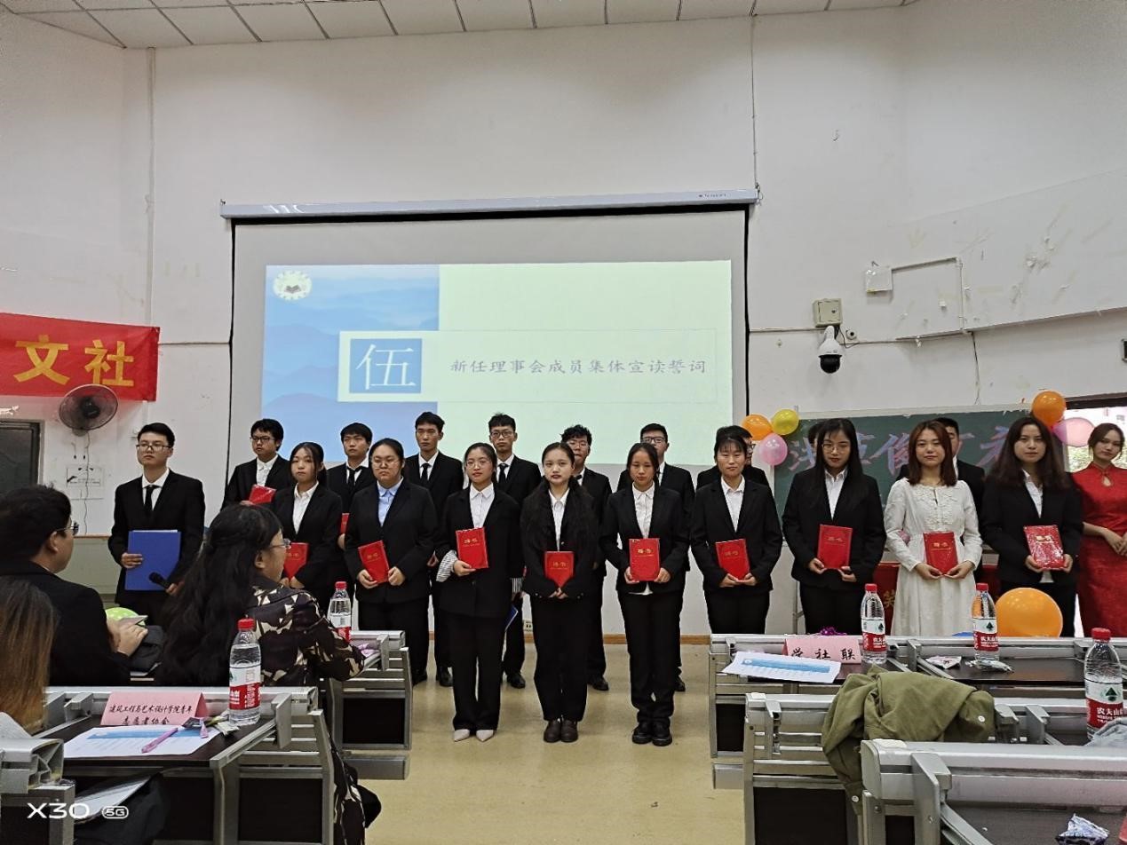 此后,第一届社长谭康平为第二届理事颁发聘书,新任理事便肩负起了浅草俊文社的重担。随后第二届社长张梦做就职演讲,相信在新社长的带领下,浅草俊文社的明天将会更加的美好。