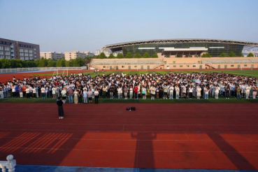 在清晨的微光中,军容严整的国旗护卫队踏着铿锵有力的步伐,伴随着国歌护卫国旗健步入场。鲜艳的五星红旗冉冉升起。全体师生肃立,面向国旗行注目礼。
