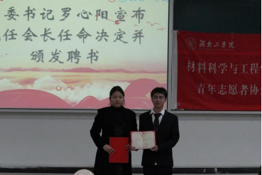 11月25日材料科学与工程学院青年志愿者协会在建工楼6106开展第四届换届大会,学工办副主任罗心阳辅导员老师谌雯洁、黄柳柔,青年志愿者协会全体成员参加。