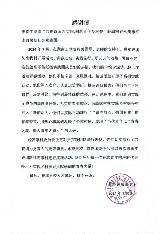 图 11江永县恒鲜记生态农业公司给予团队感谢信